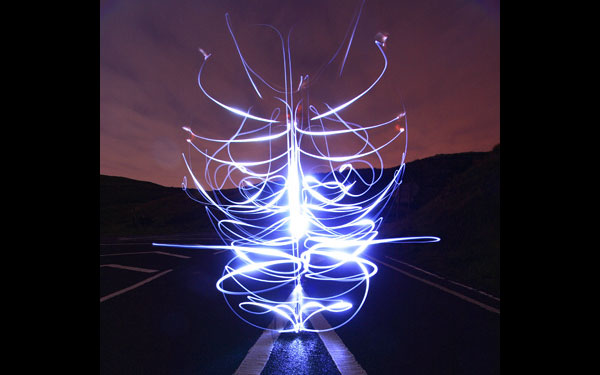 Light painting. Great fun! You need a tripod for this and long shutter speeds of between 5 and 30 seconds (you can go longer). This image will have been taken using something like a simple flash light. Over a 10 second exposure the camera will only record the light source, the person holding the light cannot be seen as they are not bright enough to be recorded and they would have been in constant motion. The brighter parts of the line will have been created by pointing the light source directly at the camera.